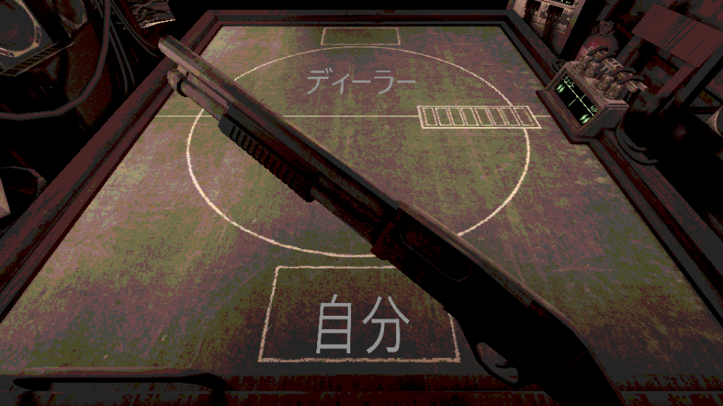 プレイヤーはショットガンを使った「命がけのゲーム」に参加し、ディーラーとの対戦を行います。