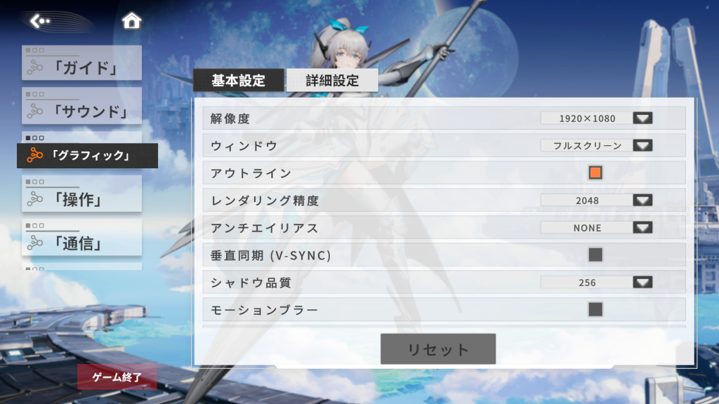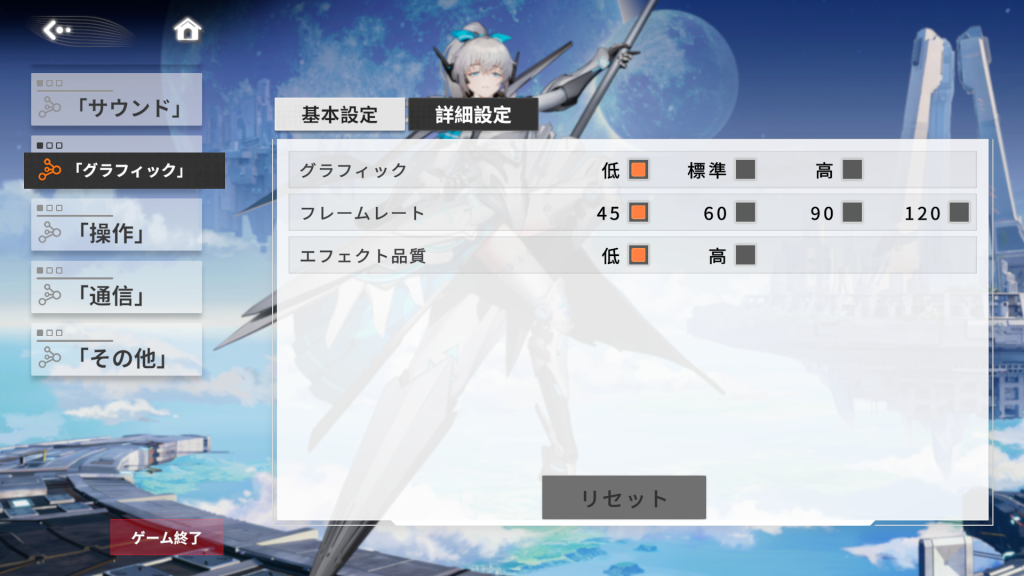 「基本設定」の多くを「低」もしくは「45」にすると比較的軽く動作します。